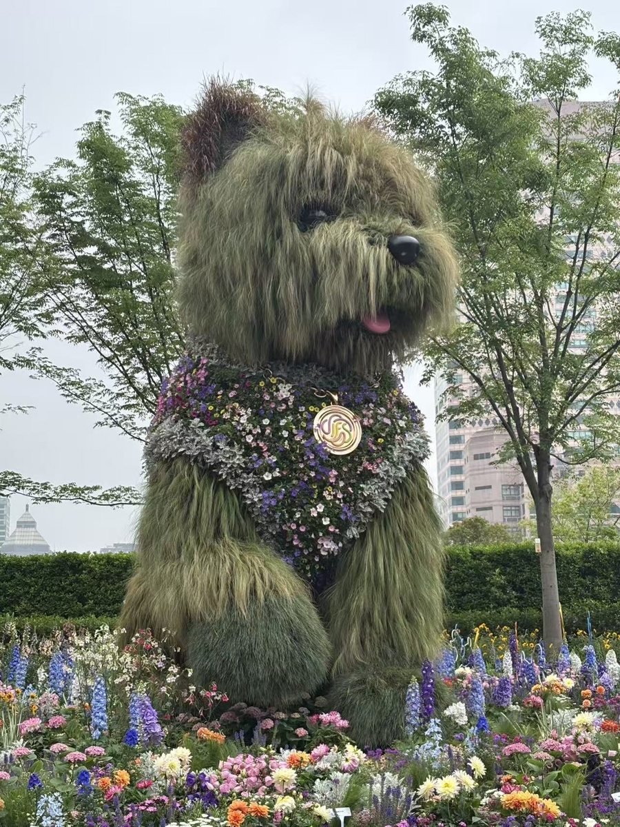 这两天,如果来到静安,或许会在转角遇到一个五米多高的“西高地小狗”,浑身毛茸茸的,穿着蓝白相间的花背心,正懒洋洋地趴在草地上晒太阳。它是用真实的植物一株一株“种”出来的。