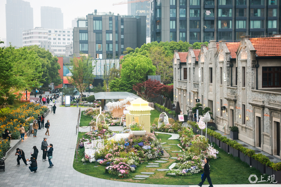 在南京西路商圈,自南京西路、青海路路口起,由东至西依次设置了8个花卉装置。在同福花园,可以打卡“摩登花影”装置。这里以花卉为媒介,融合光影元素,将商业与自然、快节奏与慢生活完美衔接,成为都市转角处兼具观赏性与体验感的花漾展厅。在张园,建筑外墙以及窗阳台上呈现了丰富多样的挂花装置,并结合地面布置花海瀑布,营造独属于张园的特色风景。